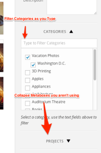 With the big push in WordPress 3.5 to improve the media modal, the need for that metafaux on the main editor page went away - but with it went one of everyone’s favorite features of this plugin. The “Searchable Categories” field, the input box that let users filter the categories that were showing, making the metabox easier to use.